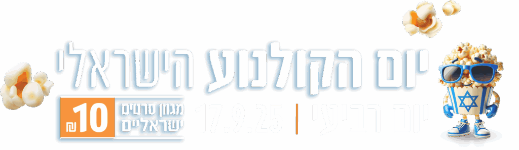 רק סרטים ישראלים ברשותות ובבתי הקולנוע | 10 ש"ח לכרטיס עד גמר המלאי | תקף להקרנות באולמות רגילים בלבד | ביום זה לא יתקבלו מבצעי 1+1, של כל חברות האשראי ולא של מועדונים | המחיר המיוחד תקף ליום 17.9.2025 בלבד | לא ניתן לקנות כרטיס במחירי המבצע עבור יום אחר | רכישת כרטיסים בקופות הקולנוע ובאתר האינטרנט או באפליקציה | במידה ולקוח רכש כרטיס ולא מימש – לא יהיה החזר כספי ולא העברה של המימוש ליום אחר | אין כפל מבצעים, עלות כרטיס ברכישה באינטרנט ביום הקולנוע כוללת תוספת רכישות אונליין, יש לבדוק | מחיר סופי באתרי הרשתות ובתי הקולנוע