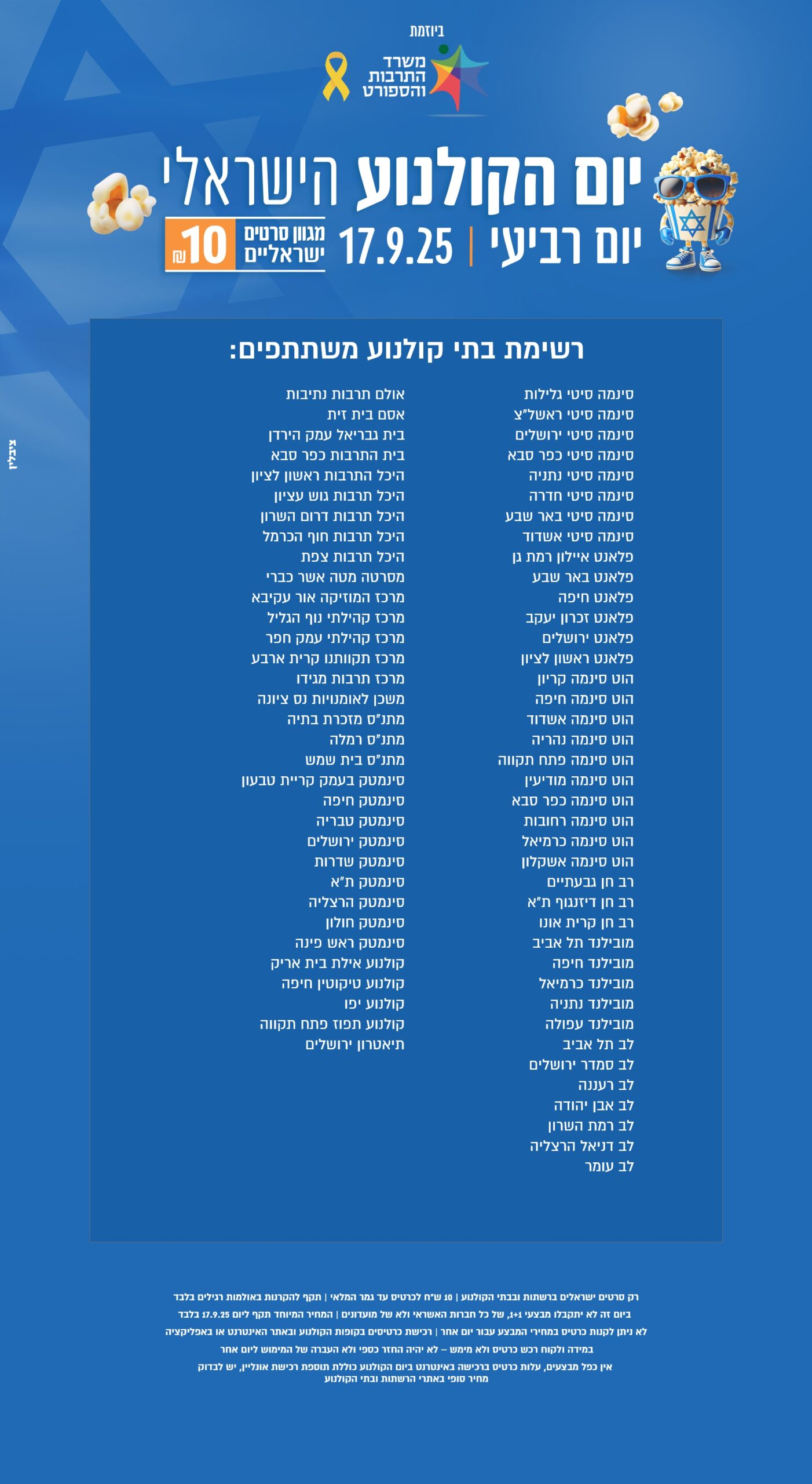 רק סרטים ישראלים ברשותות ובבתי הקולנוע | 10 ש"ח לכרטיס עד גמר המלאי | תקף להקרנות באולמות רגילים בלבד | ביום זה לא יתקבלו מבצעי 1+1, של כל חברות האשראי ולא של מועדונים | המחיר המיוחד תקף ליום 17.9.2025 בלבד | לא ניתן לקנות כרטיס במחירי המבצע עבור יום אחר | רכישת כרטיסים בקופות הקולנוע ובאתר האינטרנט או באפליקציה | במידה ולקוח רכש כרטיס ולא מימש – לא יהיה החזר כספי ולא העברה של המימוש ליום אחר | אין כפל מבצעים, עלות כרטיס ברכישה באינטרנט ביום הקולנוע כוללת תוספת רכישות אונליין, יש לבדוק | מחיר סופי באתרי הרשתות ובתי הקולנוע